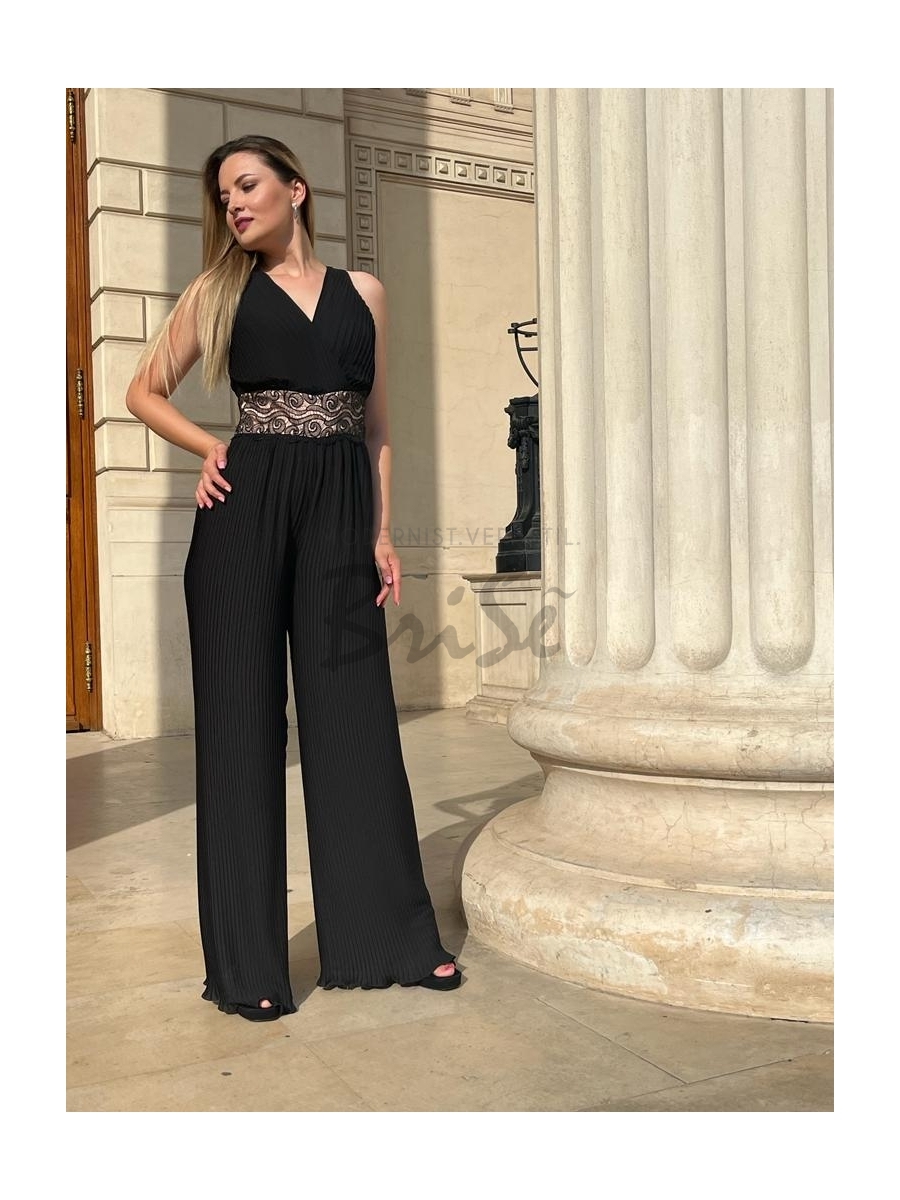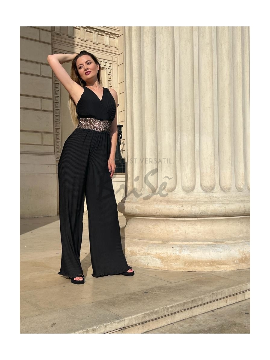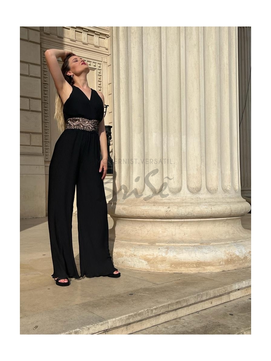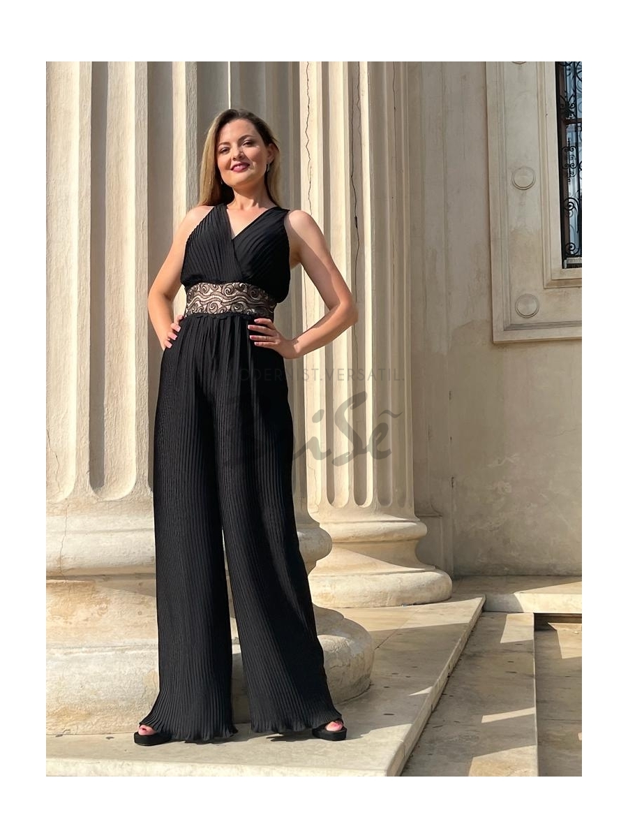Salopeta Adara neagra din voal plisat cu aplicatie pe talie