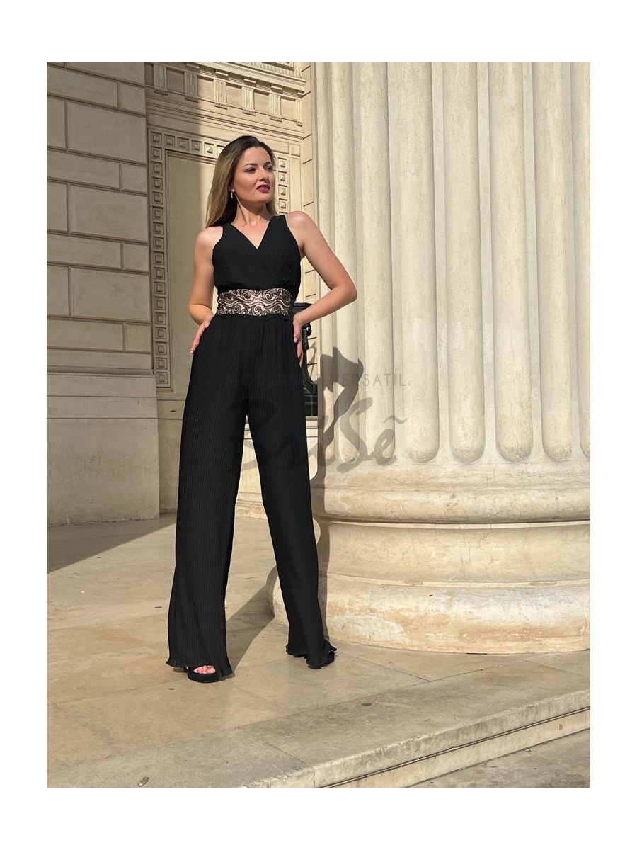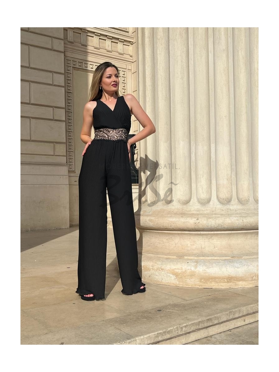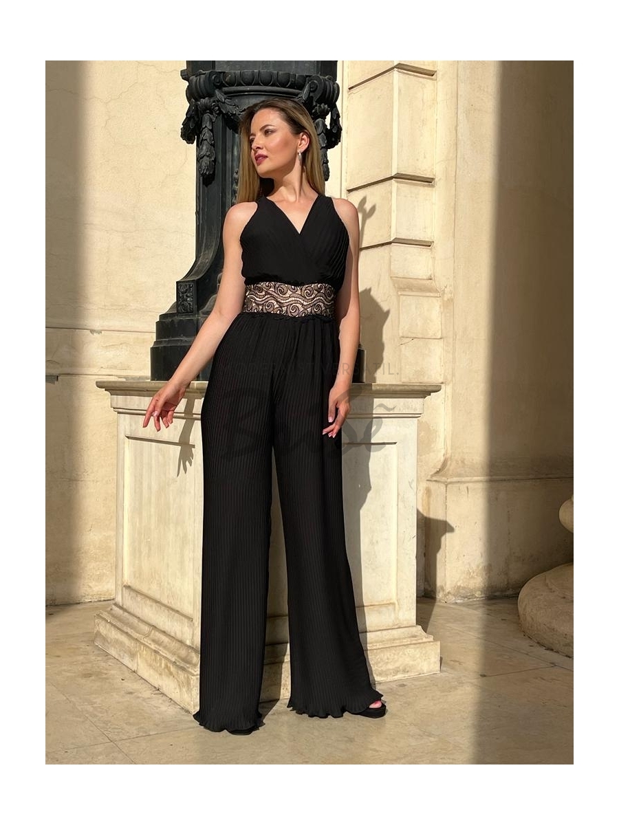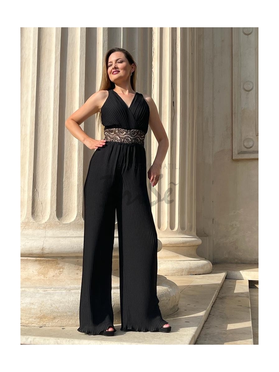 Salopeta Adara neagra din voal plisat cu aplicatie pe talie